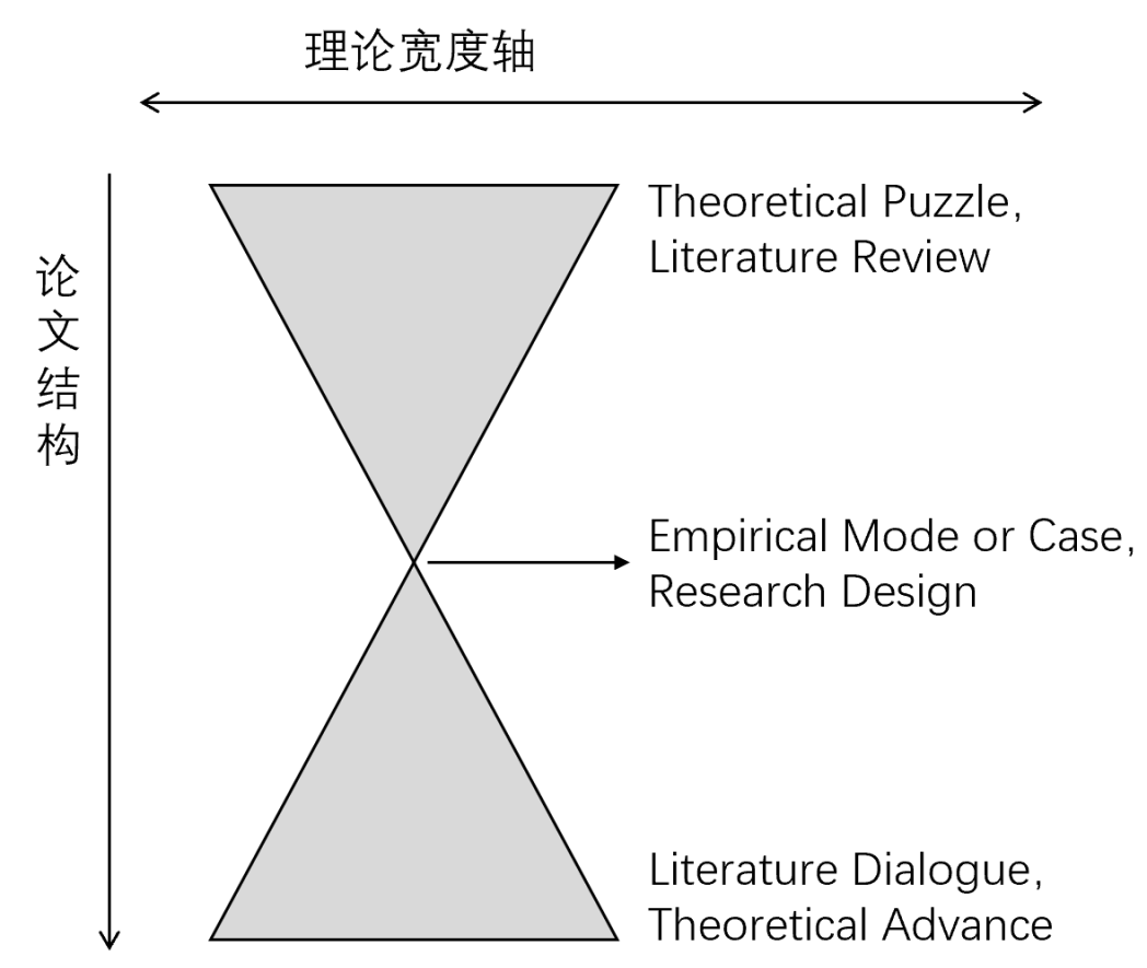 经验故事或经验模型的背后是一个什么理论问题?我的经验案例和实证模型最终可以为这个理论问题提供什么样的新答案或新思路?只要思考清楚这个问题,才是好的研究,一个有层次的研究。上学期在一次定量研究方法课上,老师说好的学术论文是沙漏型的,虽然实证模型或经验案例其实是一个点,但是首尾是很宽阔很大的,具有理论宽度和知识广度的,实证模型和案例这个点其实是为了回应理论和知识问题的。我深表赞同,我根据这个沙漏模型,自己也画了一个我心目中真正符合学术标准的论文模型。